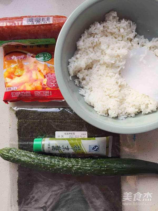1、萝卜干,盯宙米饭,烤紫菜,芥末酱,火腿,黄瓜