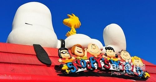 1、★“SNOOPY大屋”这是一栋4.5米高的巨型犬舍,躺卧在屋顶上的“史诺比”犬是世界最大的户外雕像(长5.5米、宽3米、高3.5米),展出花生漫画迷的作品(以雕像为主);