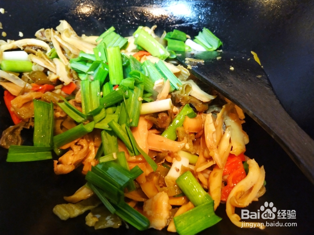 5、倒入墨鱼片,翻炒。将干水加入料酒中,炒熟。炒的同时加入少量的水(水量是看不到锅里的水)。重复3-4次,使辣椒酱的味道溶化成墨鱼片。