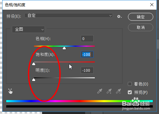 4、然后点击Ctrl+U调出色相饱和度,然后将明度和饱和度将到最低