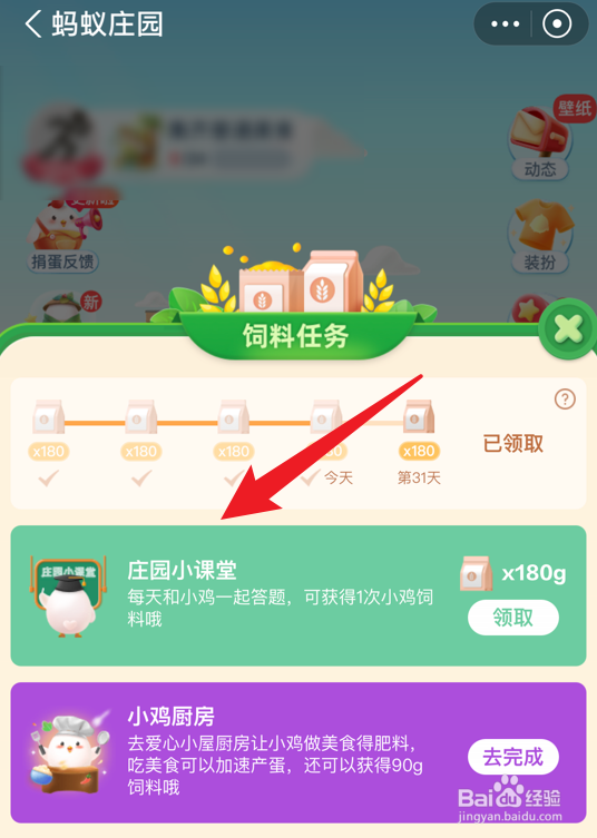 1、打开蚂蚁庄园页面,并点击进入庄园小课堂。