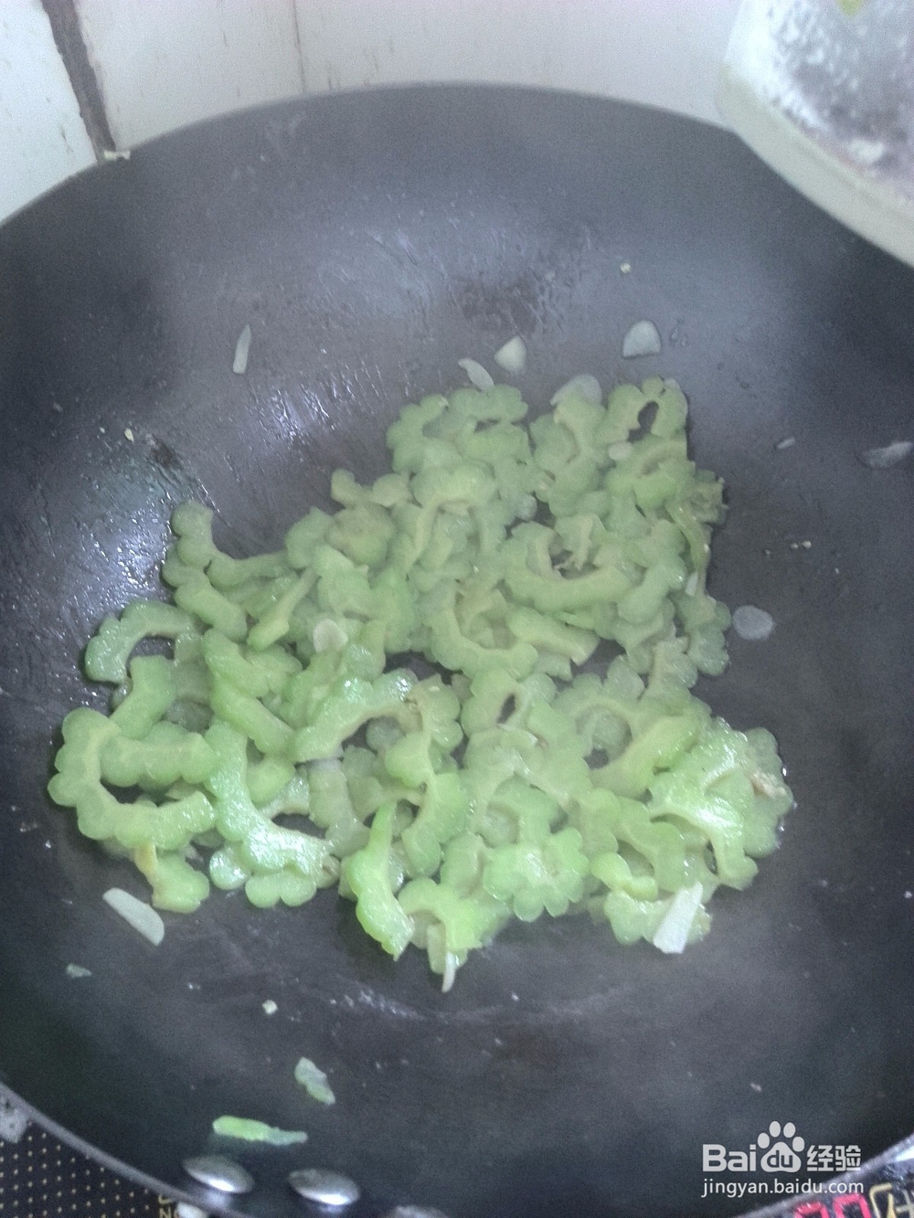 5、锅内继续放油,倒入切好的苦瓜和蒜,翻炒,然后(关键来了)加入两小盖陈醋(可根倌栗受绽据菜的份量加),继续炒至苦瓜变软,过程中如果苦瓜水器皆阄诟分不够,太干,可以边放水边炒。一次不要放太多水,等炒干点了再放,直至苦瓜炒熟。
