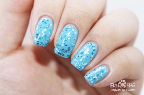 1、在所有指甲都涂胆材上天蓝色带海蓝色亮片的指甲油。