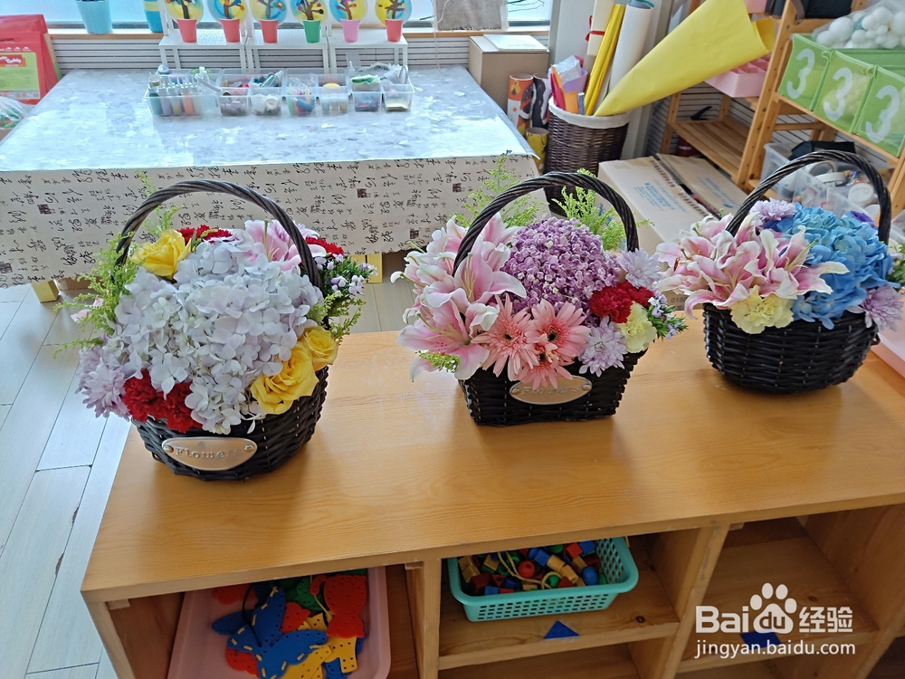 3、花篮的底做好以后我们将插画所需要的花配齐。这次我们用到的画有绣球花,百合花,康乃馨,太阳花。所有的花将叶子去掉。叶子会影响美观也会和花抢水。