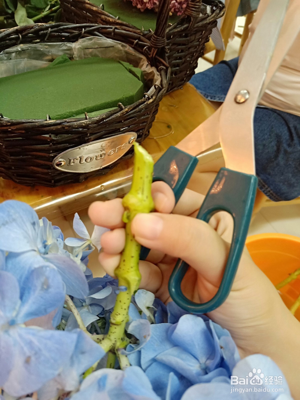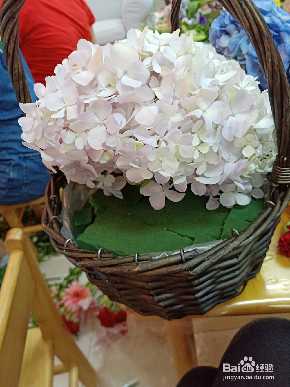2、今天插得花样式是富士山式,将绣球花插在花篮的中间,百合花均匀的围在绣球花的后面。然后再分散开来插配花。