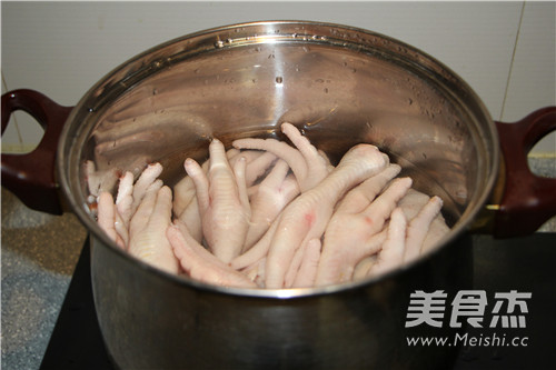 3、将处理好的鸡爪子放入煮锅,加满水,水量以漫过鸡爪为宜