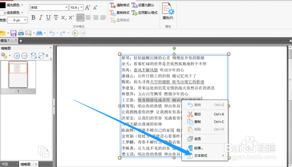 4、第四步,也可以通过移动鼠标选中文本后单击右键选择“文本样式”中的“下划线”。