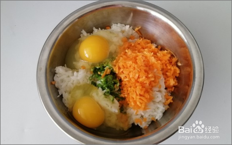2、取出蒸好的米饭,倒入一个大碗中,同时加入鸡蛋,萝卜丁,香葱碎和适量的食盐。