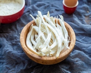 1、杏鲍菇撕成小条,放入1g食盐腌制十分钟。