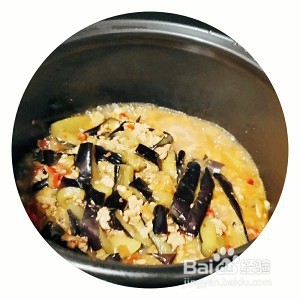 5、盛出茄子,不用放油了,直接倒入生姜、蒜、指天椒炒香,放入肉沫、生抽、冰糖翻炒68下(炒太久,肉会老)。再将茄子倒入。
