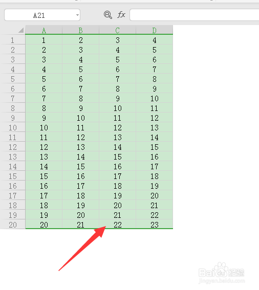 5、同样的方法,选中21行,按住ctrl+shift+下箭头,就选中了21行以下的所有单元格