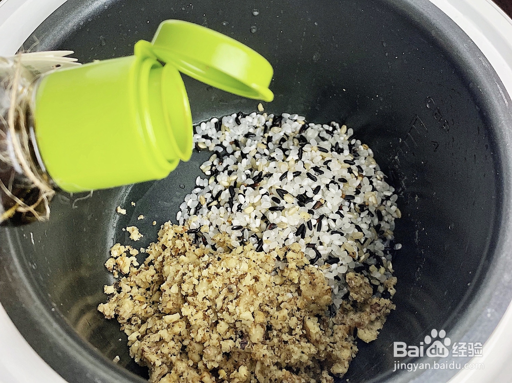 4、倒入核桃碎、酱油、米酒,加水拌匀