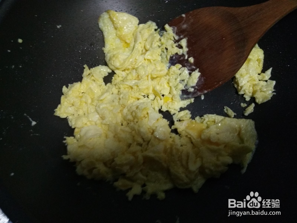 3、快速翻炒至鸡蛋凝固成块,加入适量食盐,翻炒均匀后出锅。鸡蛋不可以炒太老。