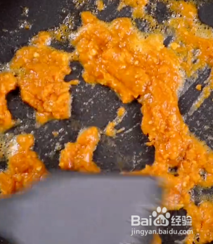 7、然后起锅烧油,油热后将咸蛋黄放入锅中,用小火翻炒至起沙