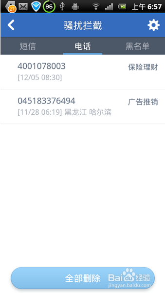 下图是进入腾讯手机管家骚扰拦截的界面,骚扰拦截也可以拦截垃圾短信,今天就不在这里详细介绍了,点击【电话】可看到的是已拦截的骚扰电话,在号码后面会明确标注管骚扰电话的类型。