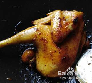 5、15分钟后,翻个面再焖煮10分钟如果汤汁干了可以加点水,最后把鸡肉翻过来,不断地淋上酱汁至表皮呈深棕色,即可出锅。