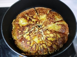 5、中火就是这样……有点焦,但不影响吃的口感。注意:因为我的量大,又喜欢厚实的口感,所以第一面煎的时候要尤其注意,不能等表面的蛋液看起来干了以后再翻面,这样往往你的底面已经焦了。这个不是蛋皮,蛋皮,蛋皮,它很厚,很厚,很厚!重要的事说三遍哈
