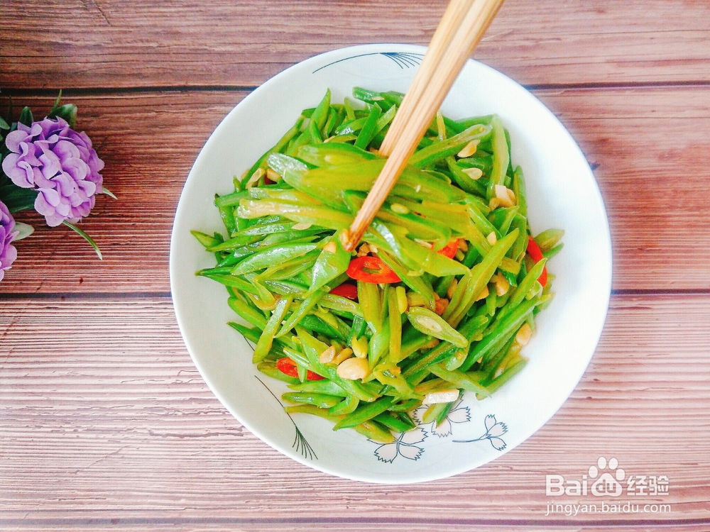 3、热锅倒油,煸香蒜末后,下入扁豆丝翻炒。