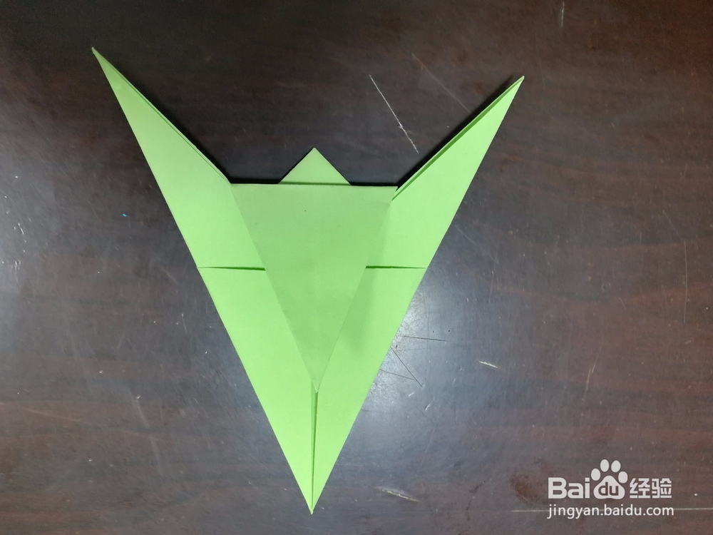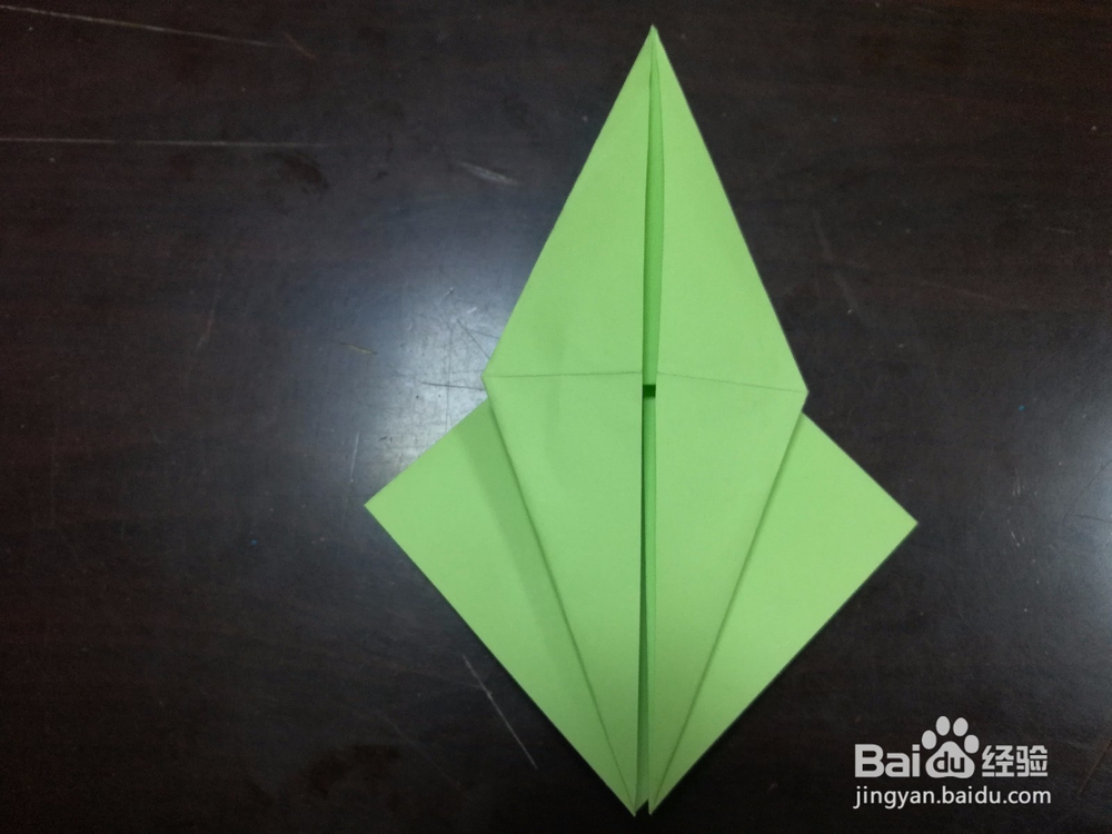 2、将开口部分的一端的角的两侧纸张对齐中线折过来,然后打开,根据折痕分别将纸边内沉至里边,并将形成的角向上打开。