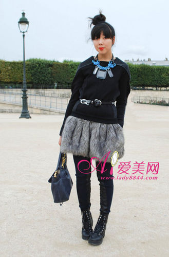 黑色款圆领上衣个性的肩部设计让人印象深刻,搭配灰色款皮草毛毛裙和两色拼接款打底裤,外加一双帅气的系带短靴,项链和腰带起到了很好的配饰作用,整身look时尚又有潮范儿!