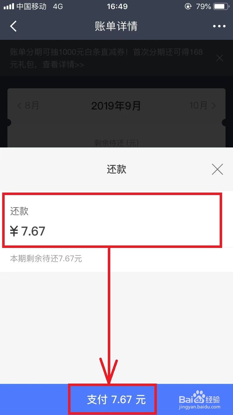 5、进入【账单详情】页面,点击页面中【还款】按钮,在弹出窗口中输入并确认还款金额后,点击【支付】按钮。如下图所示。