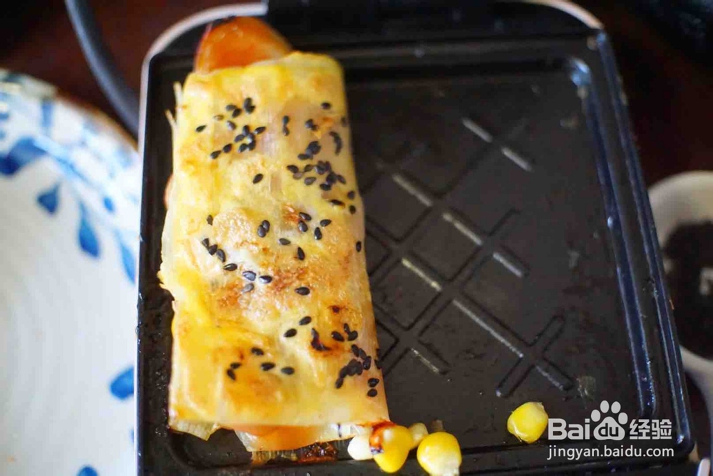 6、再放入甜玉米粒和热狗肠,淋入烤冷面酱汁,盖上盖子煎烤30秒