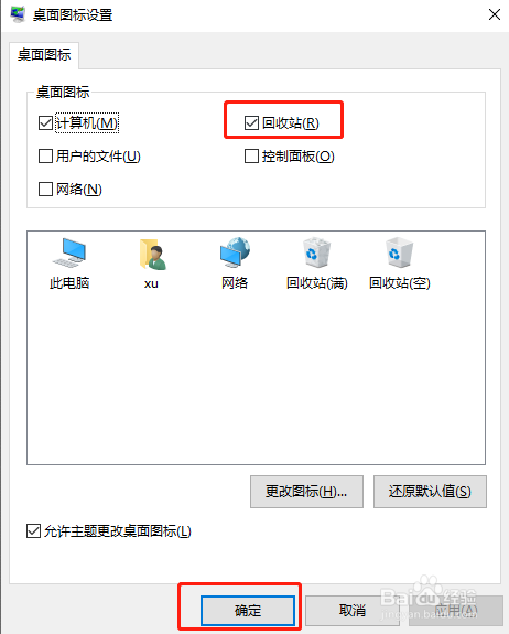 4、在桌面图标设置界面中,取消“回收站”前面的勾选并点击“确定”即可。