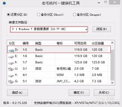 2、进入PE系统,在老毛桃PE一键装机工具窗口,点击“浏览”将win7系统镜像添加进来,然后在磁盘列表中选择D盘作为系统盘,点击“确定”即可,如图所示