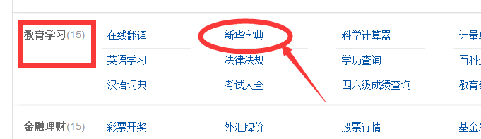 3、在查询页面,您可以看到很多跟生活非常相近的内容。一直下拉页面到“教育学习”,在教育学习右面找到“新华字典”,并点击打开。