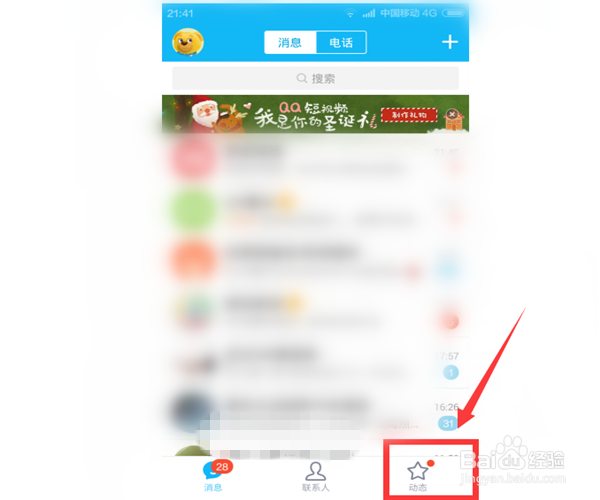 1、打开手机QQ,选择首页右下角的“动态”。注意,只有手机版QQ才能玩空间红包的,电脑版好像暂时还不可以哦。