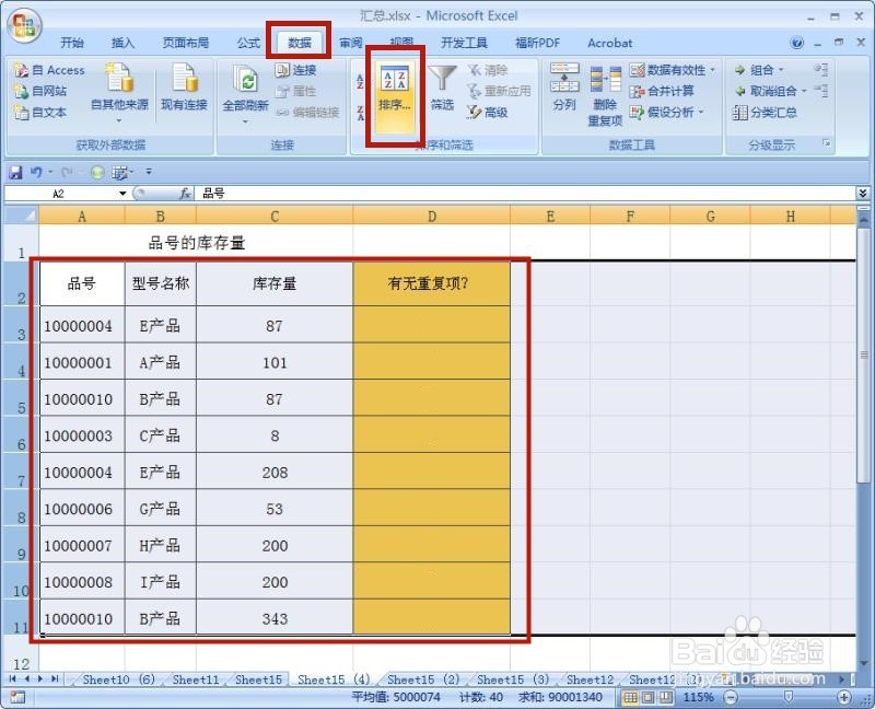 1、打开工作表,选中所有的行,然后点击“数据”菜单下的“排序”按钮。