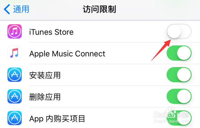 4、进入访问限制页面详情页面,将iTunes Store直接关闭,再次尝试下是否已经解决连接不上iTunes Store的问题