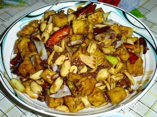 做法:1、先把豆腐切成2厘米见方的小块,用5成热的油炸至金黄色出锅,沥干油待用; 2、花生米用凉水洗净泡一会儿包去红衣,青蒜切花生米大小的段; 3、2勺糖1勺醋2勺番茄酱2勺水1勺酱油调成汁待用; 4、锅中留少些底油,一定要凉油,把辣椒和花生米同时放进锅里慢炒,火要中火,以免把花生米炸糊,要不停的翻炒至金黄色,把豆腐放进锅中炒几下,倒入调好的汁翻炒,上色,放青蒜,盐再炒几下就可以关火出锅了。