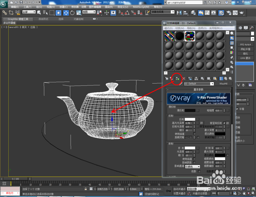 5、点击【材质编辑器】,弹出材质编辑器设置栏,点击【standard】-【VRayMlt】设置一个VRay材质球,按图示参数对材质球进行设置。将玻璃材质球附加给模型后,点击【渲染】出图即可。
