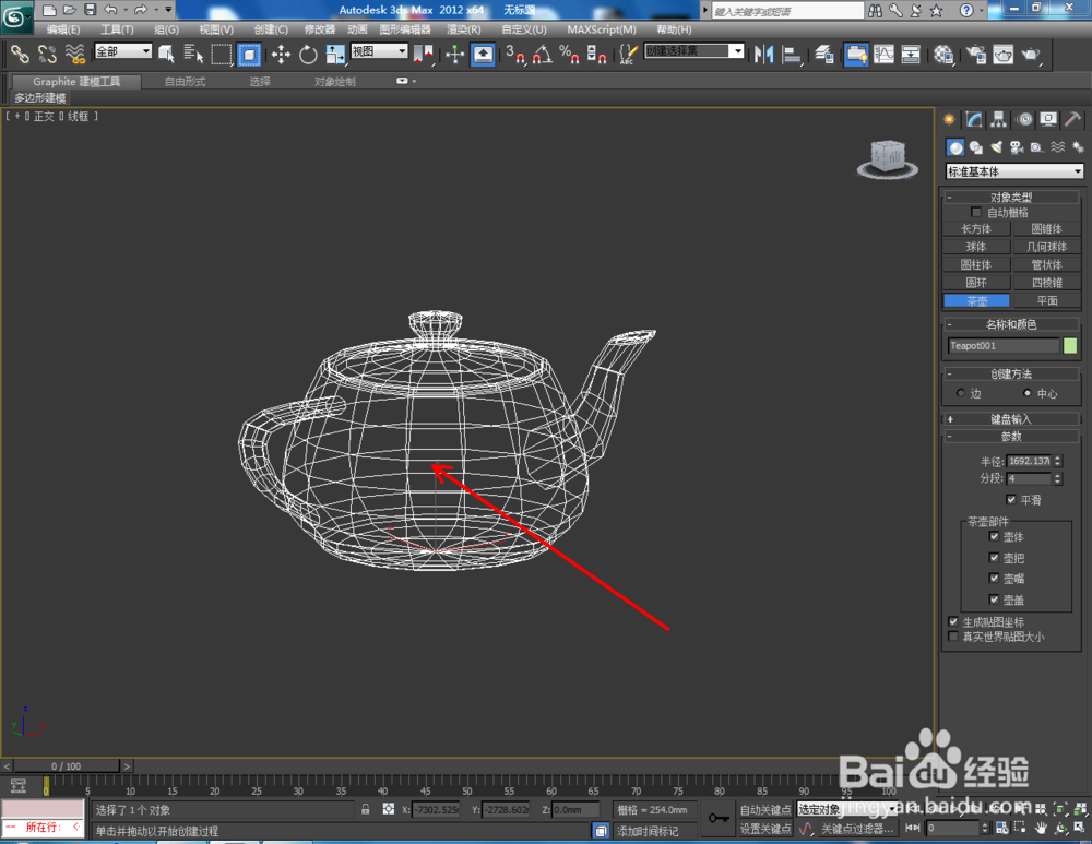 1、打开3Dmax2012软件,点击【创建】-【几何体】-【标准基本体】-【茶壶】,在作图区域绘制一个茶壶模型并将茶壶的分段参数设置为:10,对象颜色设置为:白色(如图所示);