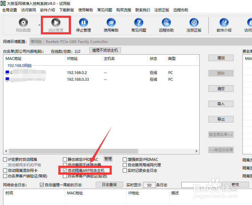 7、通过以上方法可以实现局域网ARP防护功能,且能够实现电脑正常访问网络功能。但是也存在明显的局限性,一方面对于ARP攻击源的追踪并不总是能成功,尤其是针对隐藏式IP攻击行为。另一方面对于攻击源主机无法进行主动拦截及断网操作。为了实现以上功能,我们可以借助专门用于对局域网进行防护的工具来实现,通过百度搜索下载大势至网络准入控制软件来实现。