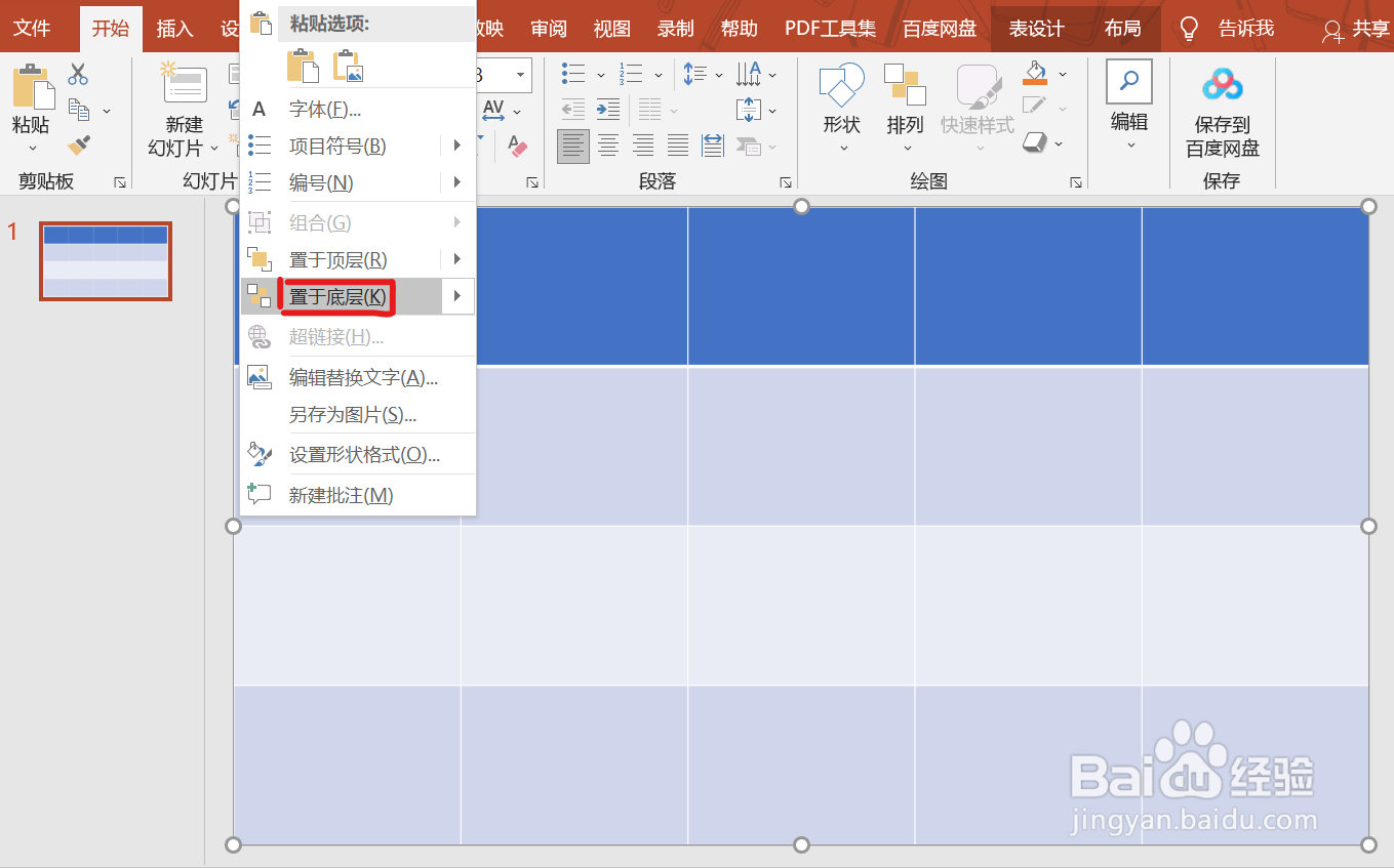 3、第三步,选中表格,点击鼠标右键将表格置于底层。