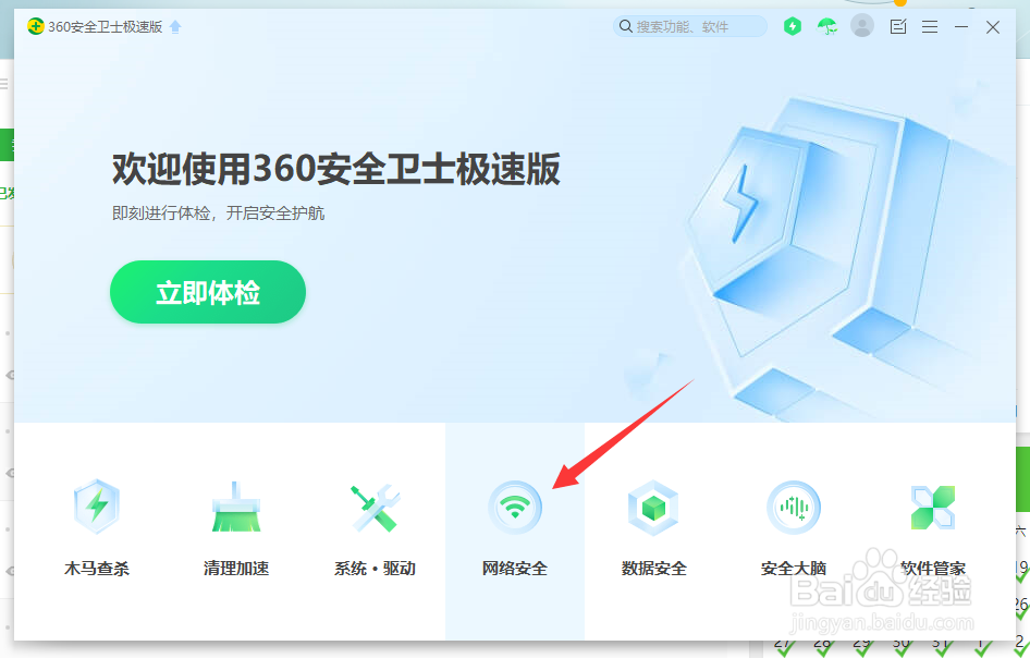 进入360安全卫士中,点击下方的网络安全功能打开进入。