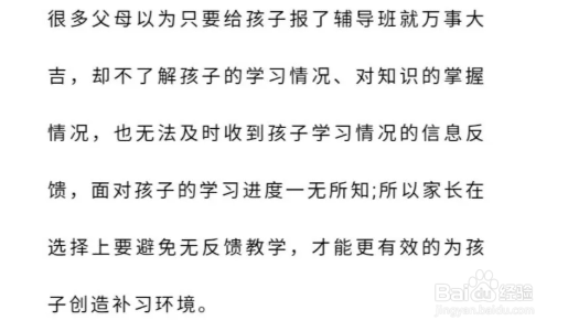 3、课外辅导也不是万能的,家长和孩子们在选择课外辅导时要注意避免走入以下误区:忽视孩子,盲目选择