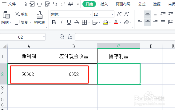3、接着输入公式“=A2-B2”,即留存利益=净利润-应付现金额。