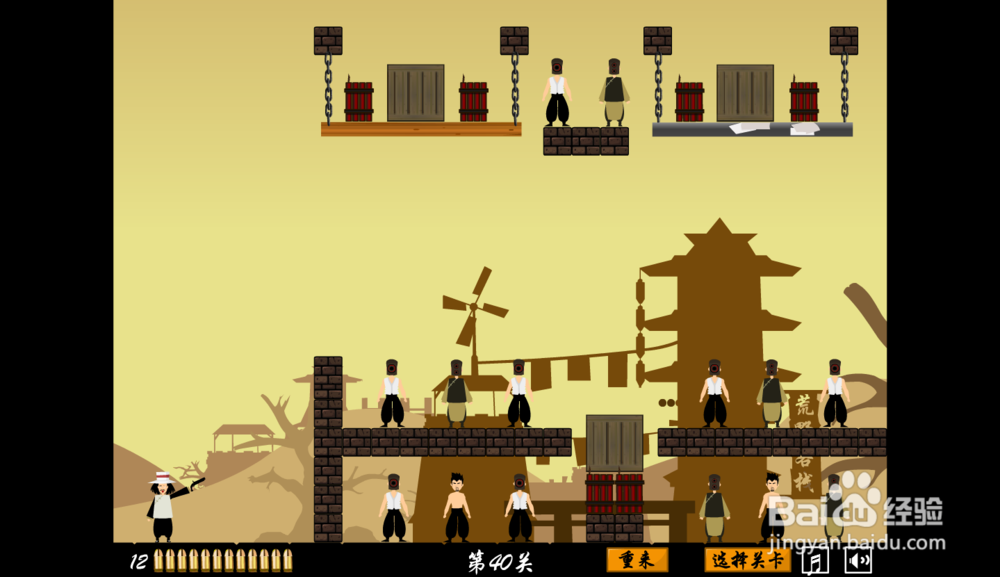 3、朝上面左数第二个墙垛上方射击,子弹反射两个墙垛中间的土匪击毙,将右边铁链打断,右边横杆上的箱子和炸药滑落到中层,将中层的土匪全部砸死、炸死,下层土匪也有个别被震死。