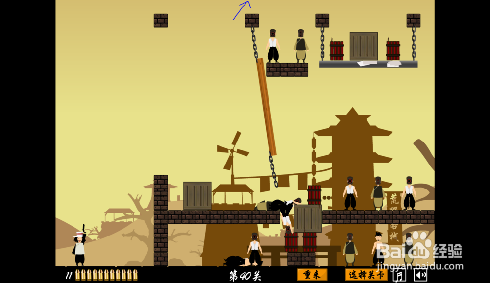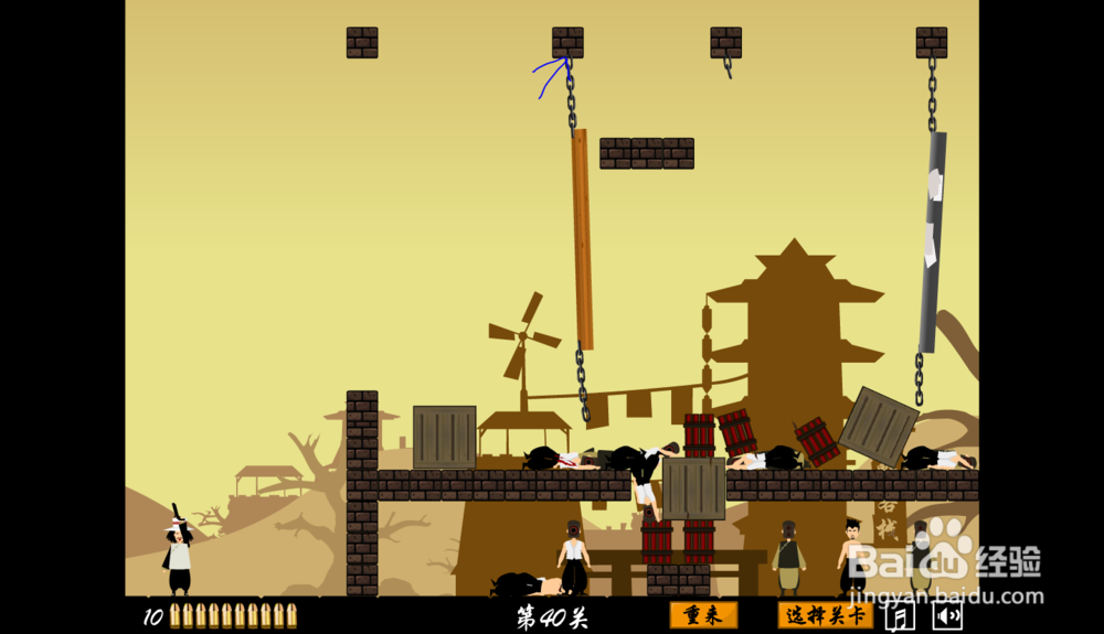 2、朝上层左侧铁链射击,铁链被打断,横杆垂下,上面的炸药和箱子滑落到中间一层墙体,将几个土匪砸死、炸死。