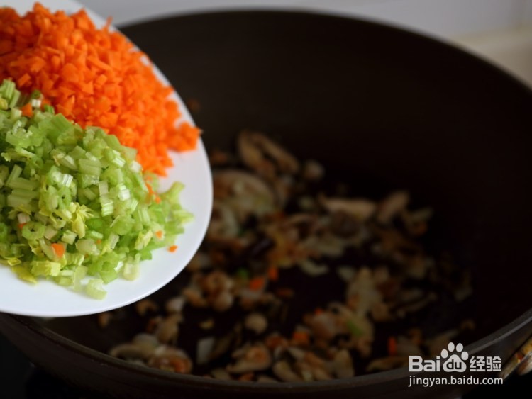 5、然后下胡萝卜和芹菜翻炒变色,加盐和白胡椒调味,盛出备用。
