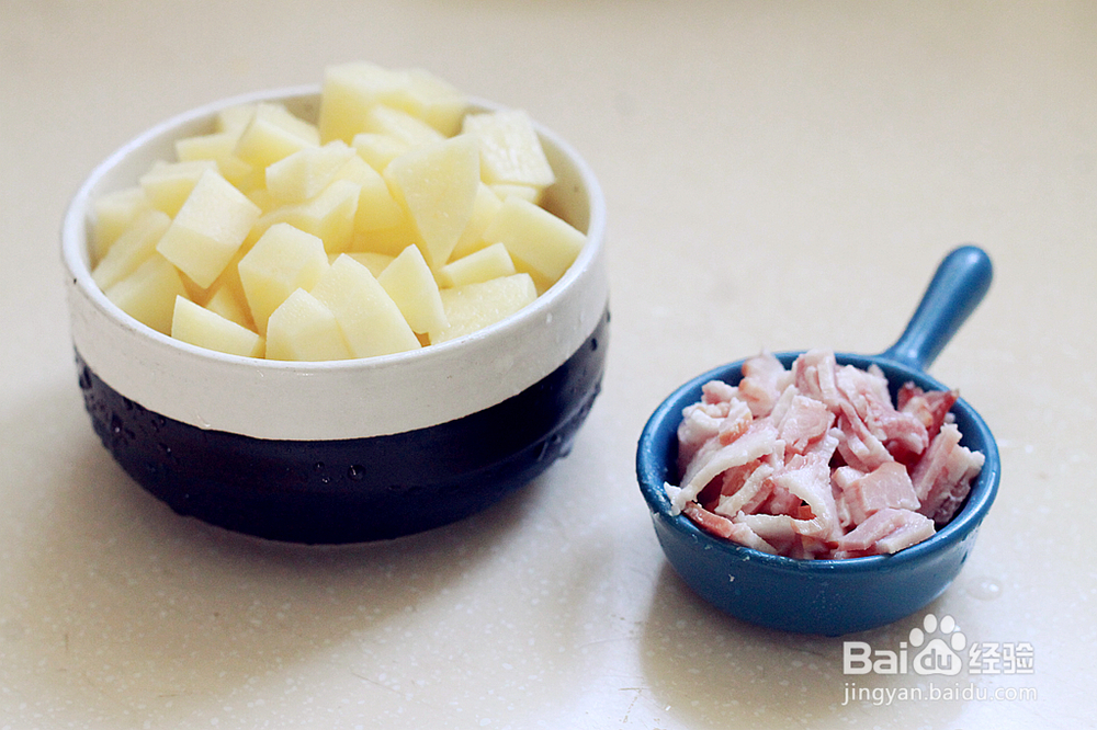 3、锅中热油,先放入土豆丁翻炒,少许盐调味。过程中转小火盖锅盖,这样让土豆丁更易熟透。外脆里嫩的口感才好吃~
