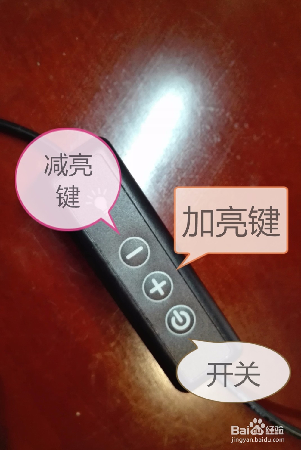 最下方的按钮是开关键,上方是减少亮度的,每按一次减去一档的亮度。下方的加号就是增加亮度,这款台灯总共有三个档位可以调节。