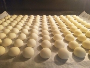 6、可以边搓圆边放在烤盘里,也可以搓一部分再放在烤盘里(搓好的小馒头也要盖保鲜膜或湿布,保持湿润防止风干),搓到最后可能面团会偏干,可以用喷壶随时喷点水,有助于搓圆