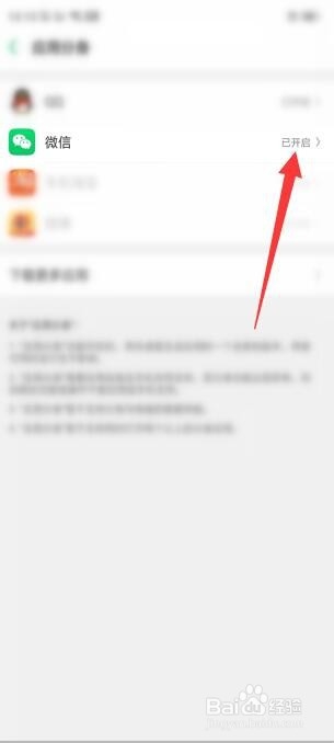 3、找到【微信】选项点击进入设置,将滑块移动至绿色开启应用分身功能,将第二个微信命名为“vx”;