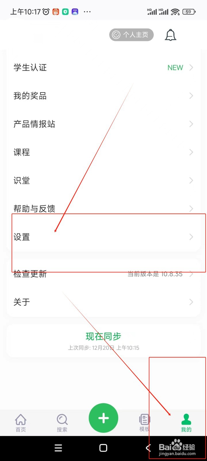 1、打开印象笔记App,在主界面点击右下角的“我的”,在我的界面中点击“设置”