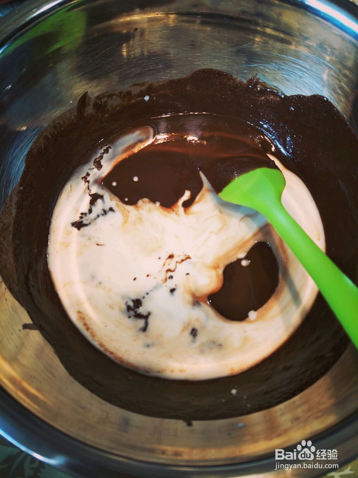 2、加入65g 85%黑巧至融化