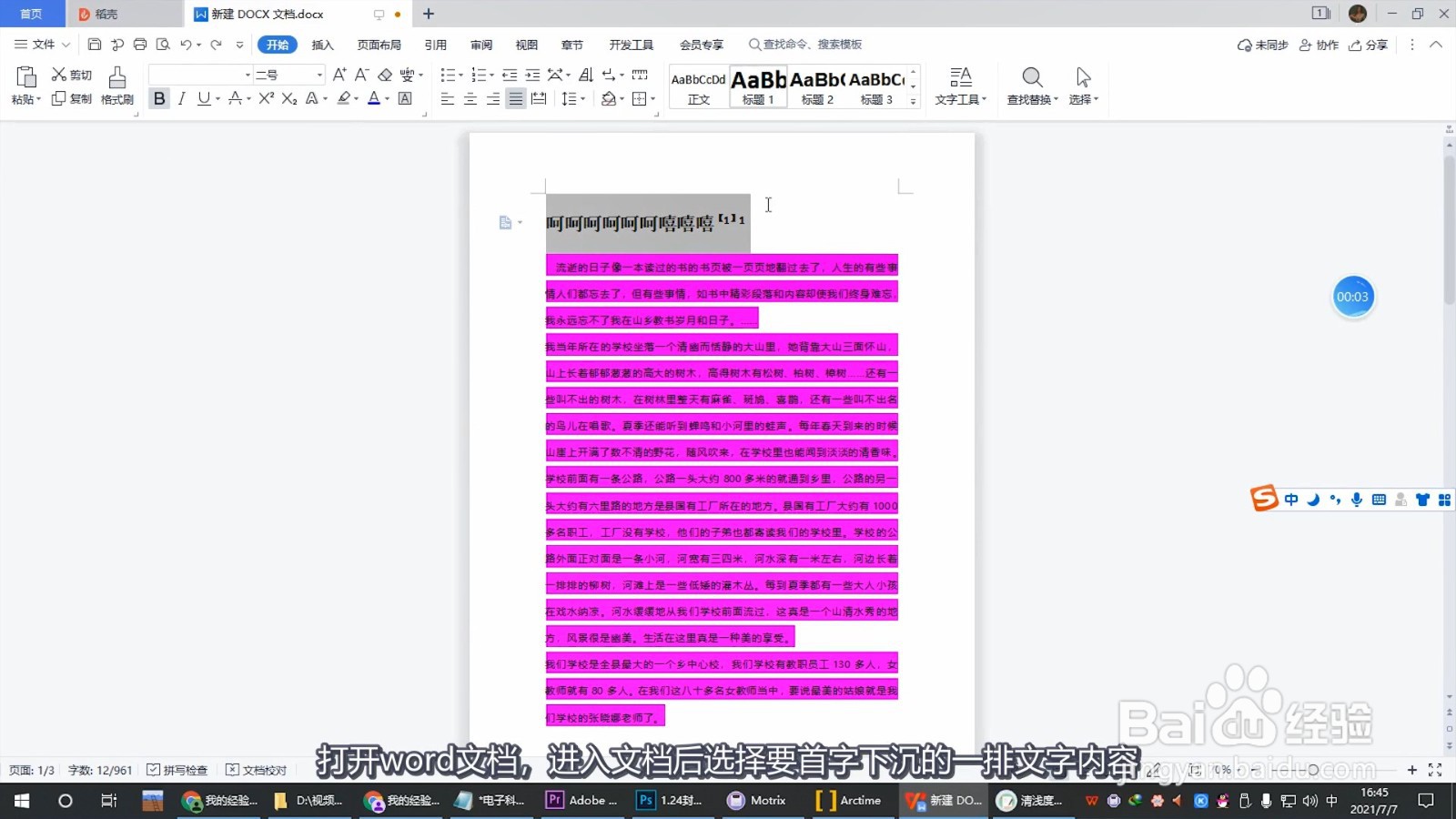 打开word文档,进入文档后选择要首字下沉的一排文字内容,选择后点击页面顶部的插入。